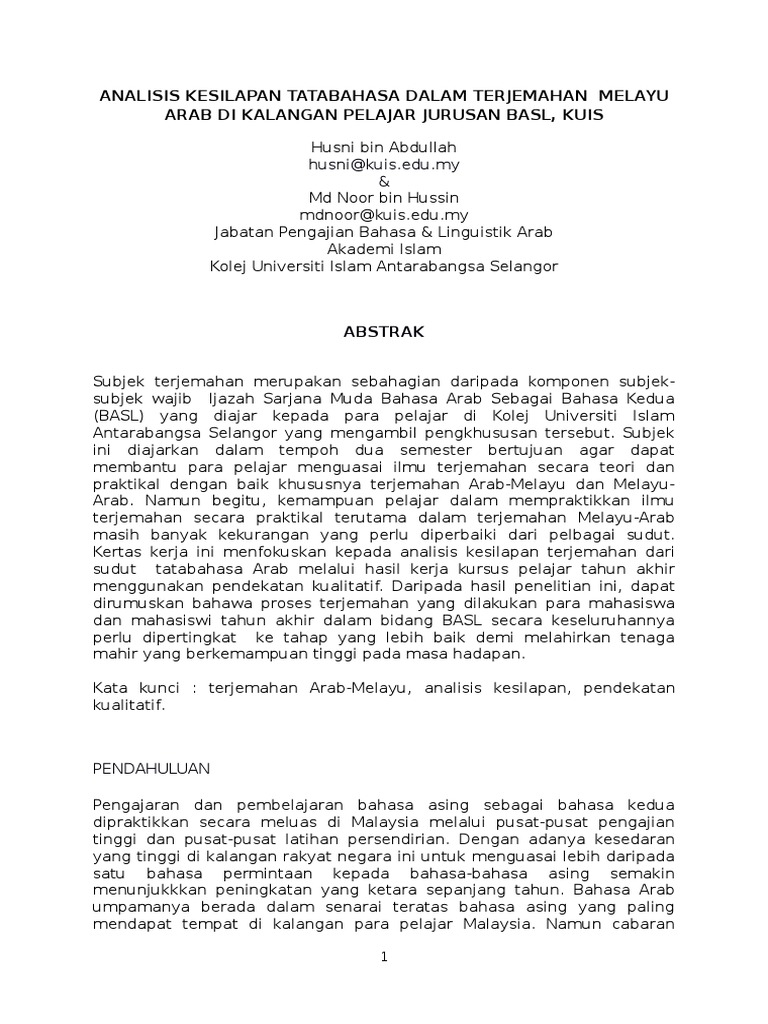 Analisis Kesilapan Tatabahasa Dalam Terjemahan Melayu Arab Di Kalangan Pelajar Jurusan Basl Kuis Pdf