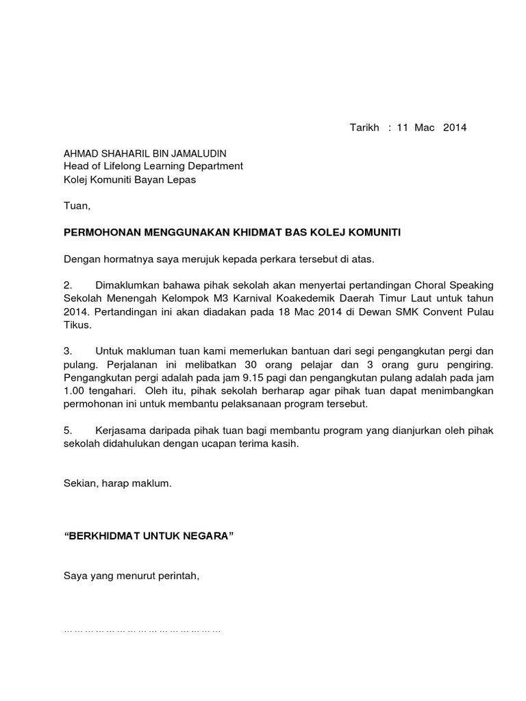 Surat Permohonan Bas Ke Kolej Komuniti Pdf